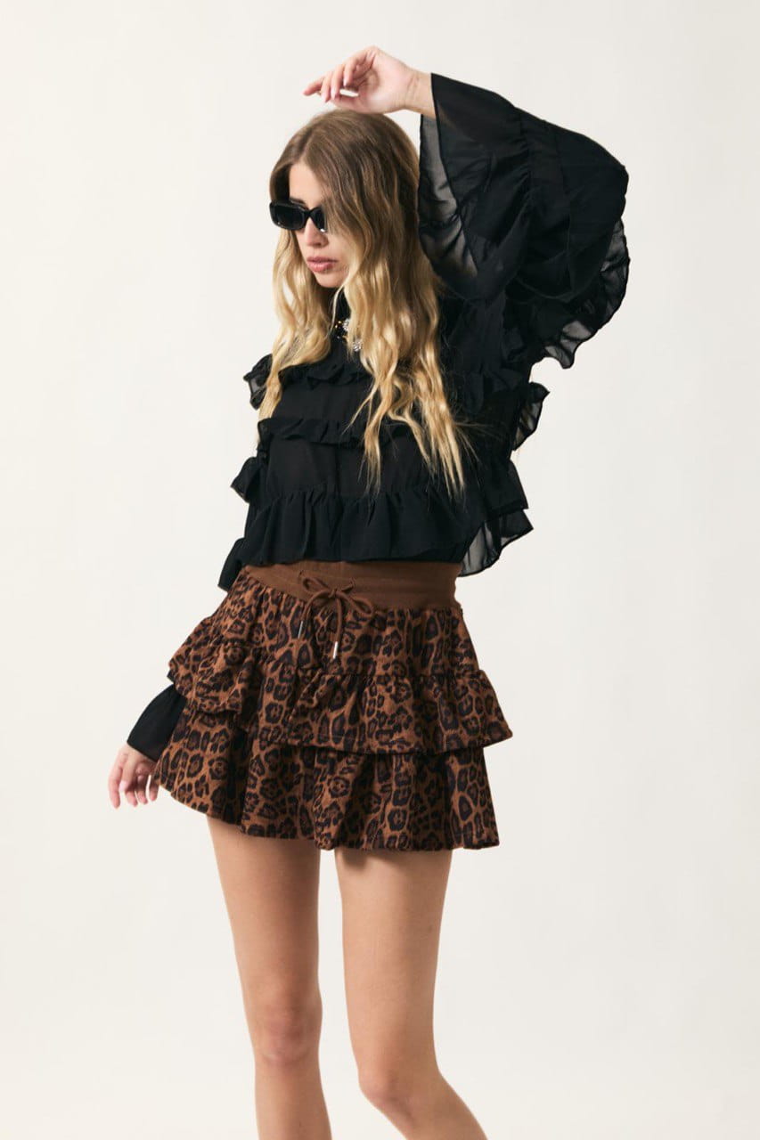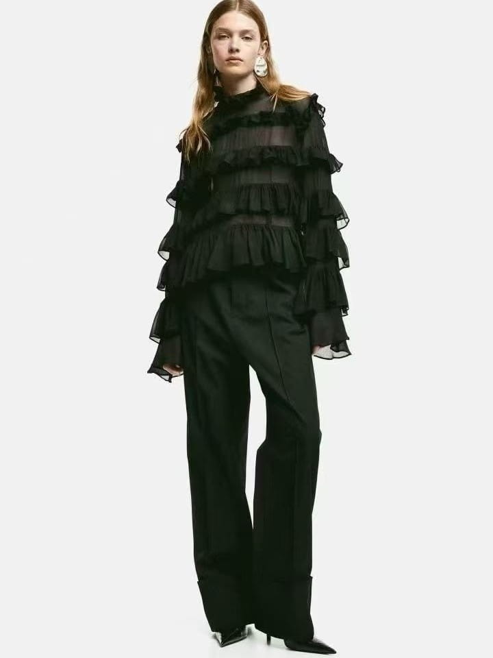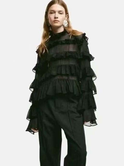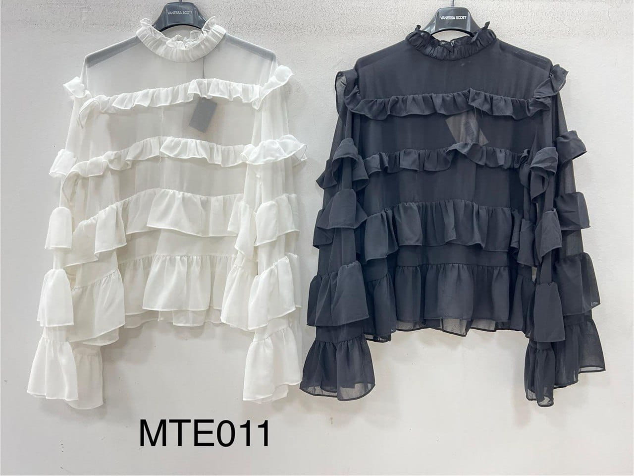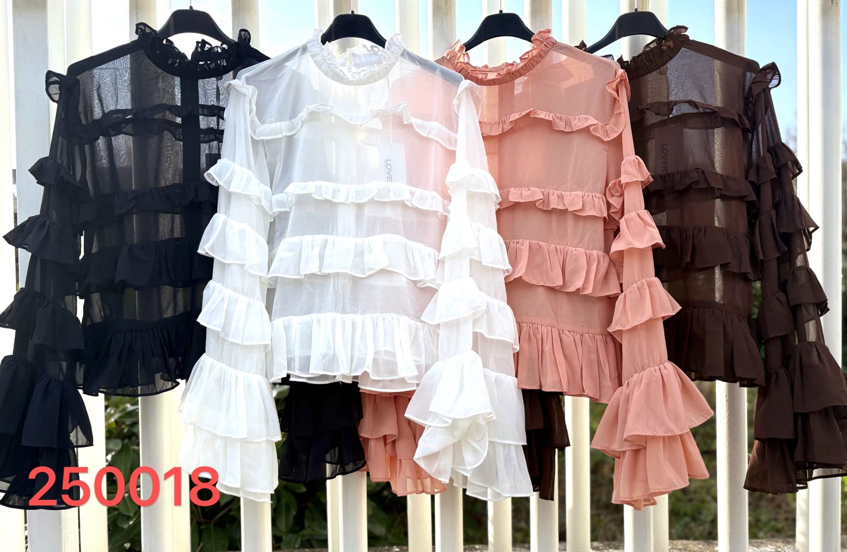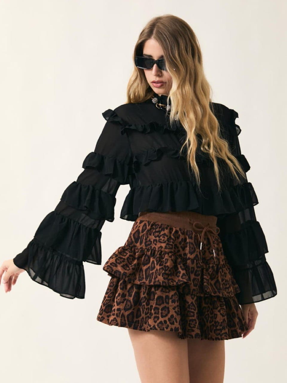 Biała bluzka włoskiej marki ze stójką z falbankami.