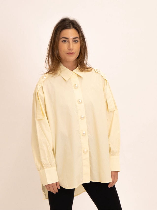 Koszula oversize z dużymi, perłowymi, ozdobnymi guzikami. Patki na ramionach.
