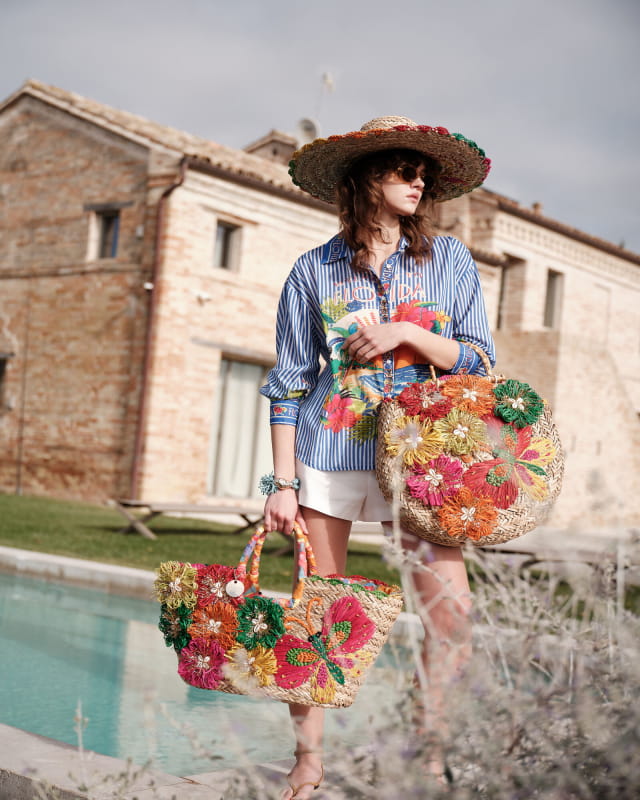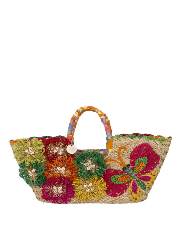 Duża torba plażowa, koszyk słomiany z kwiatami w kolorach ziemi.