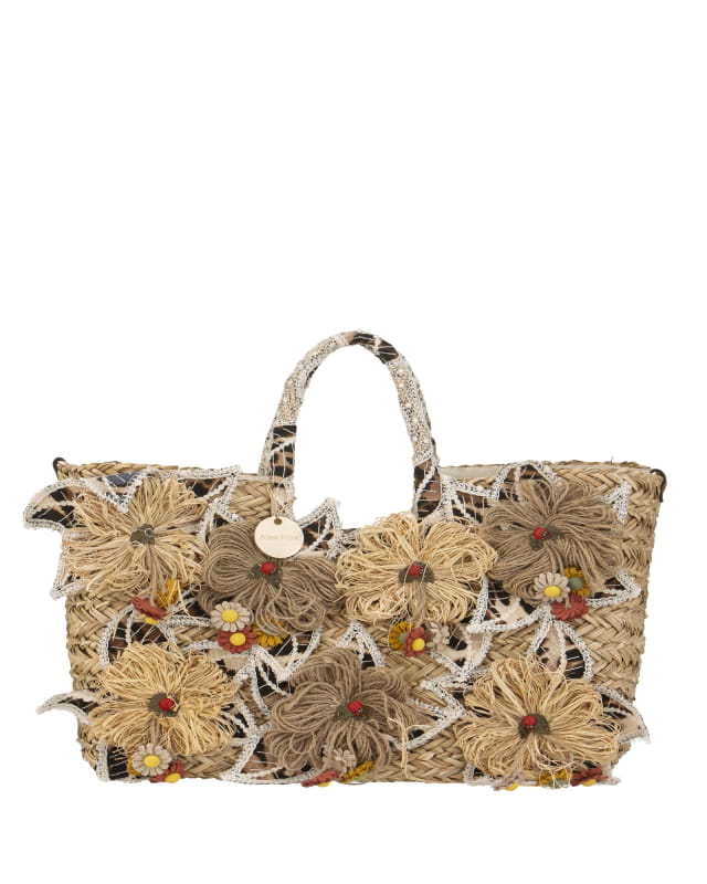 Duża torba plażowa, koszyk słomiany z kwiatami w kolorach ziemi.