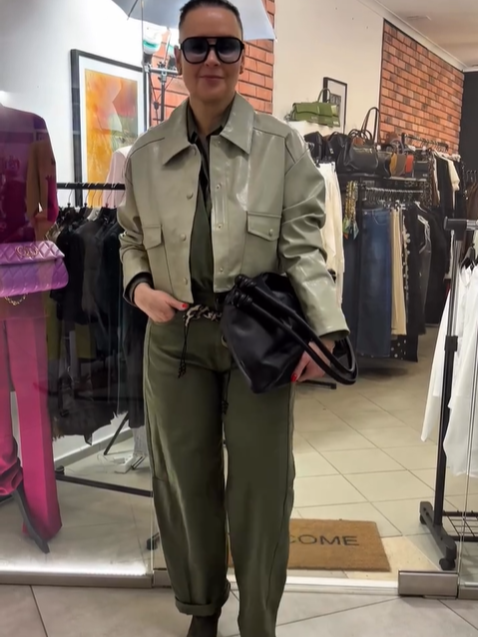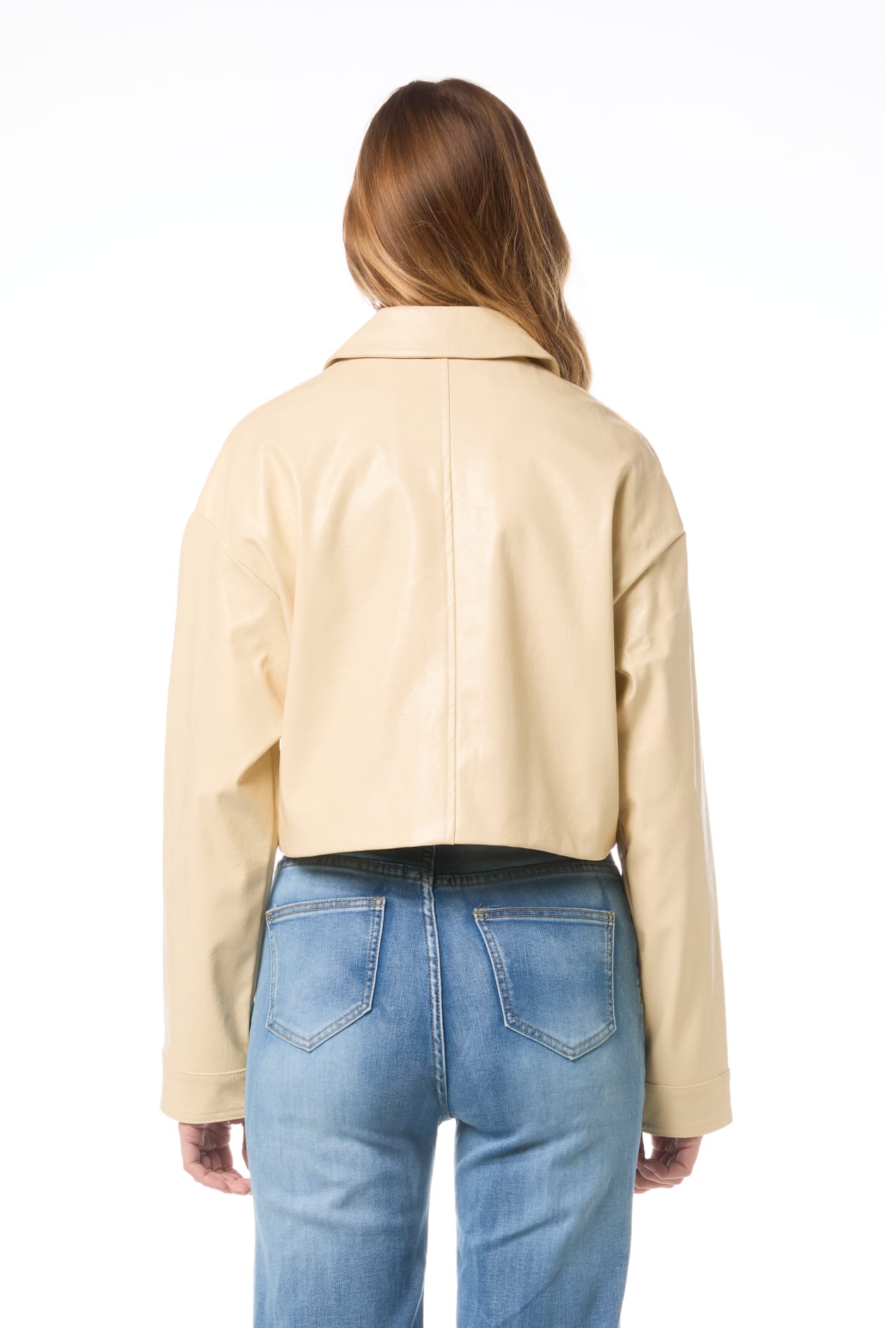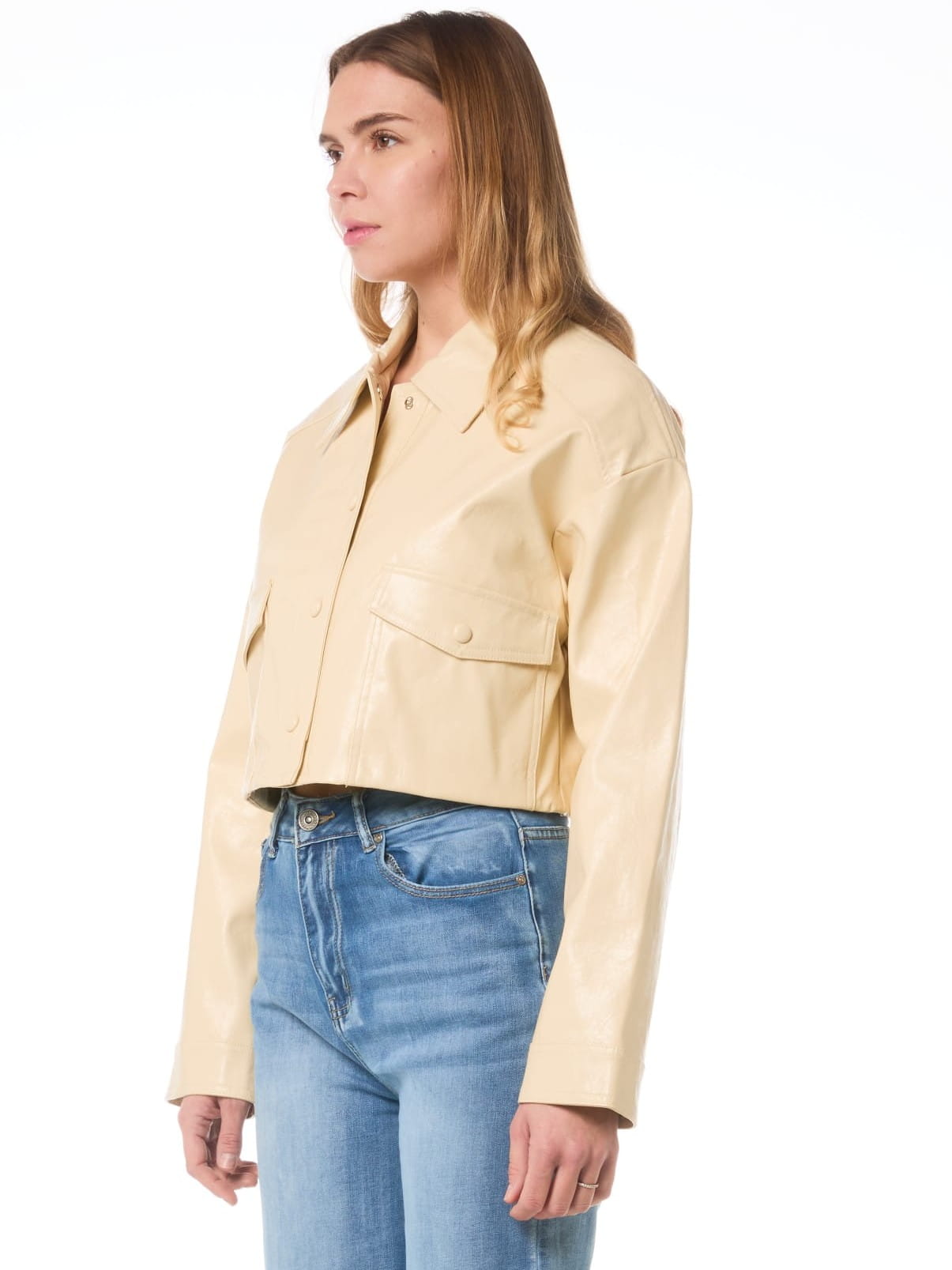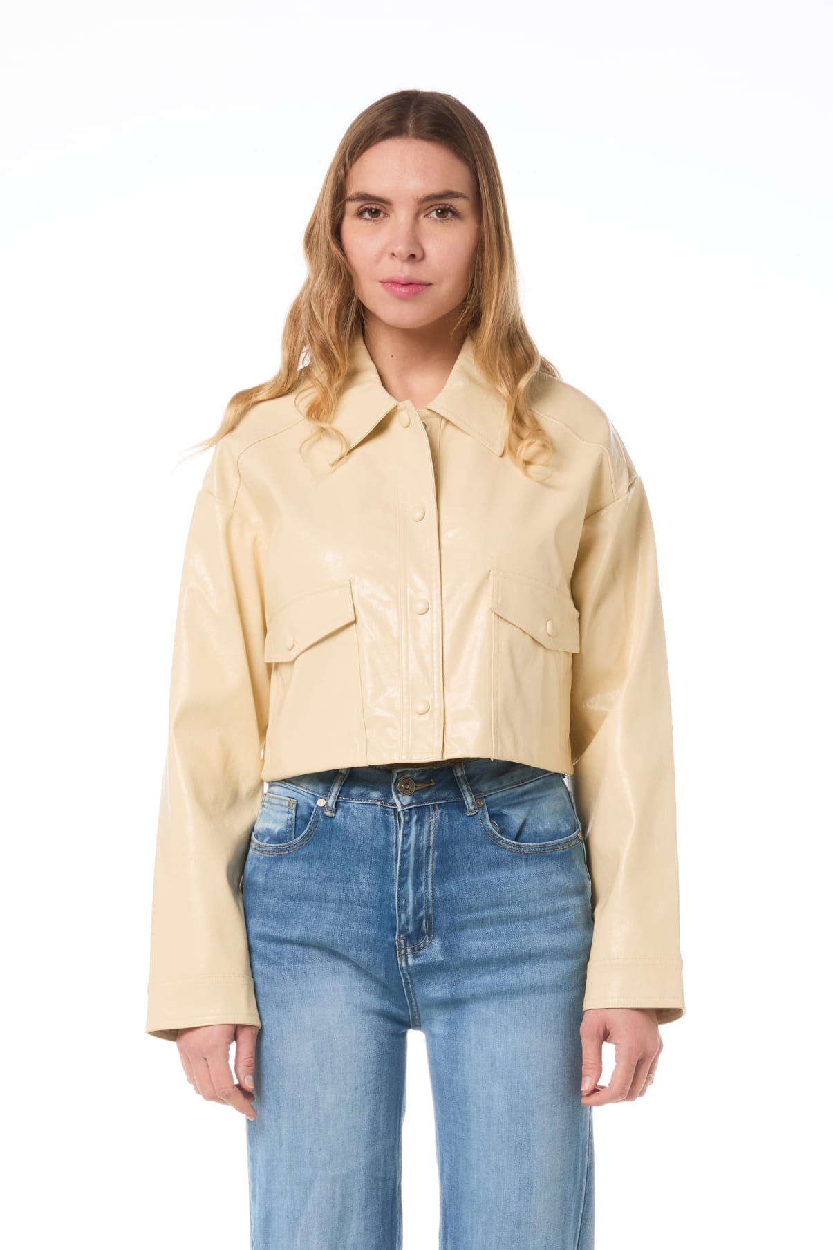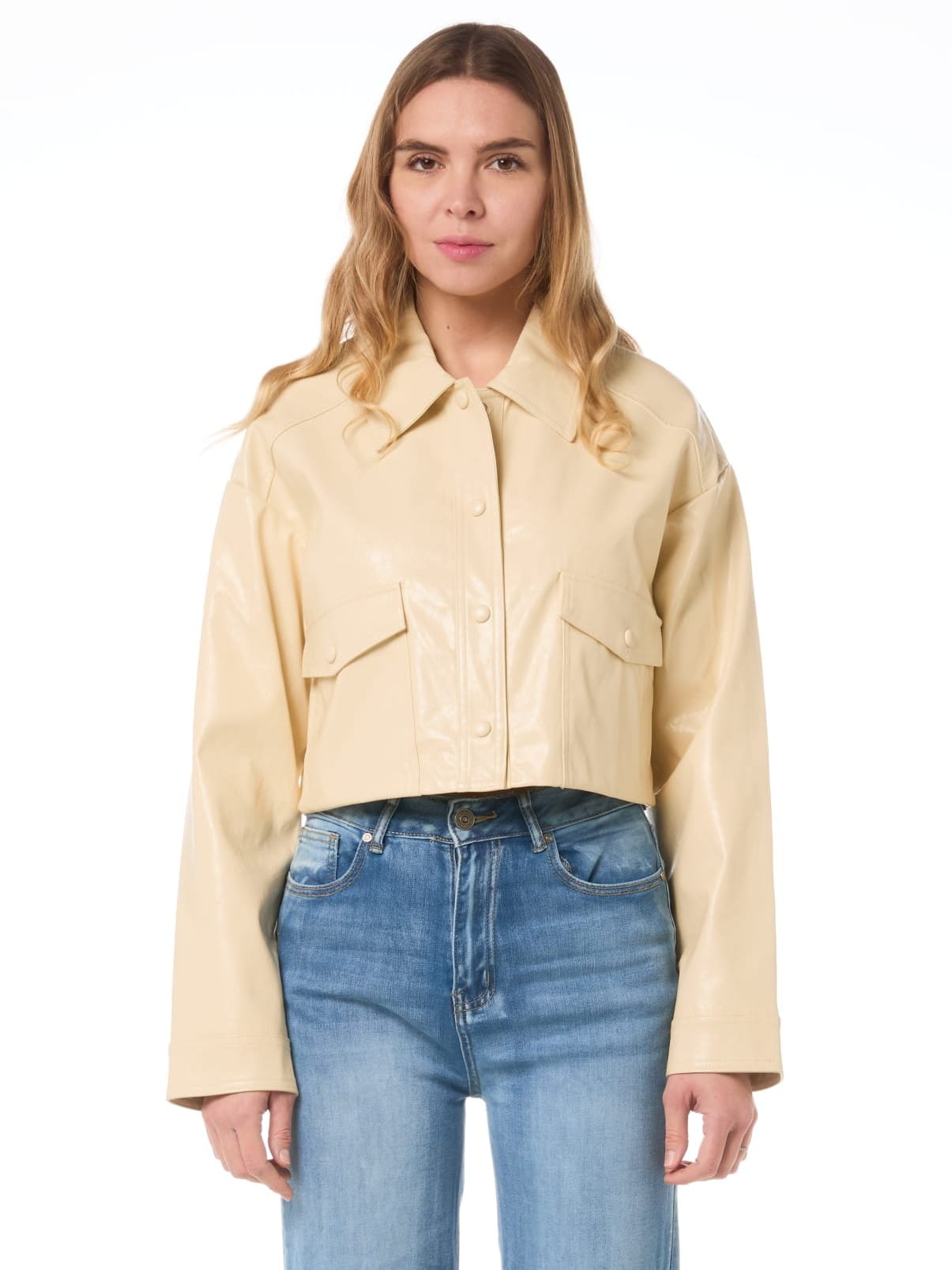 Krótka, prosta kurtka w kolorze beżowym.