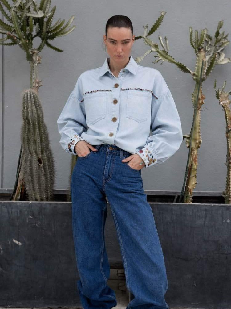 Kurtka bawełniana koszulowa z koralikami kolor niebieski