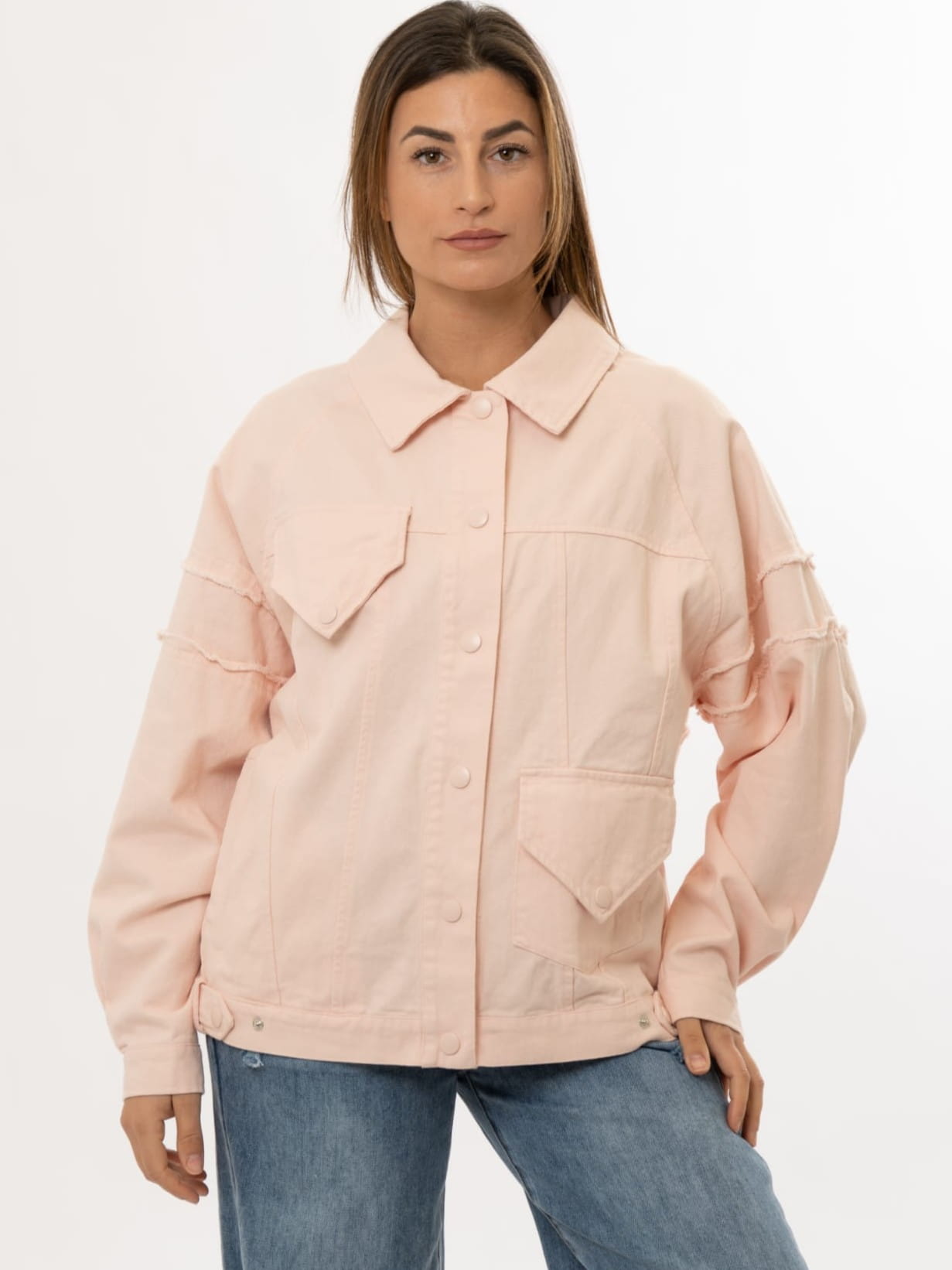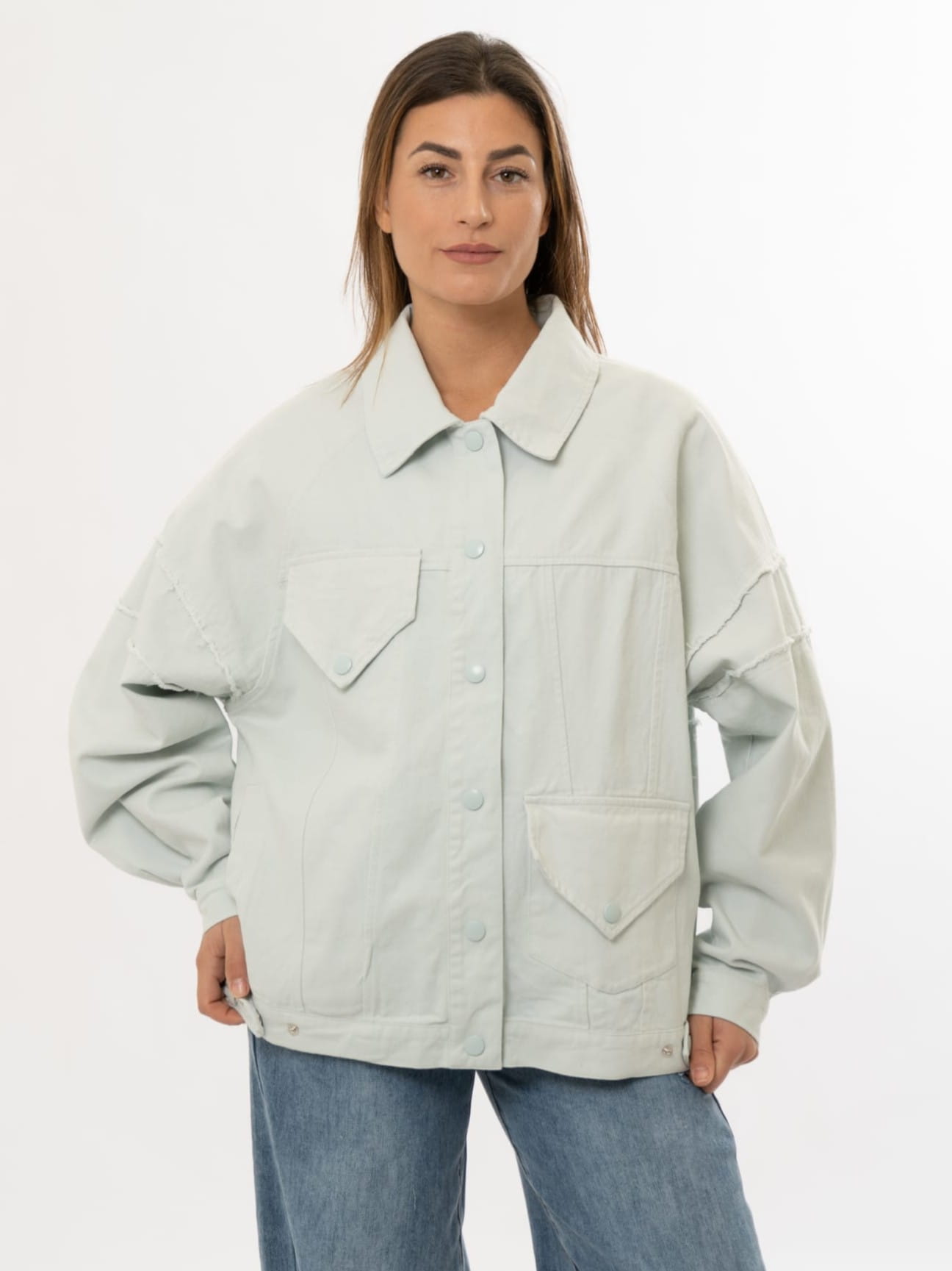 Na dole regulacja szerokości. Surowo wykończone elementy na rękawach i na plecach. Zapinana na napy.