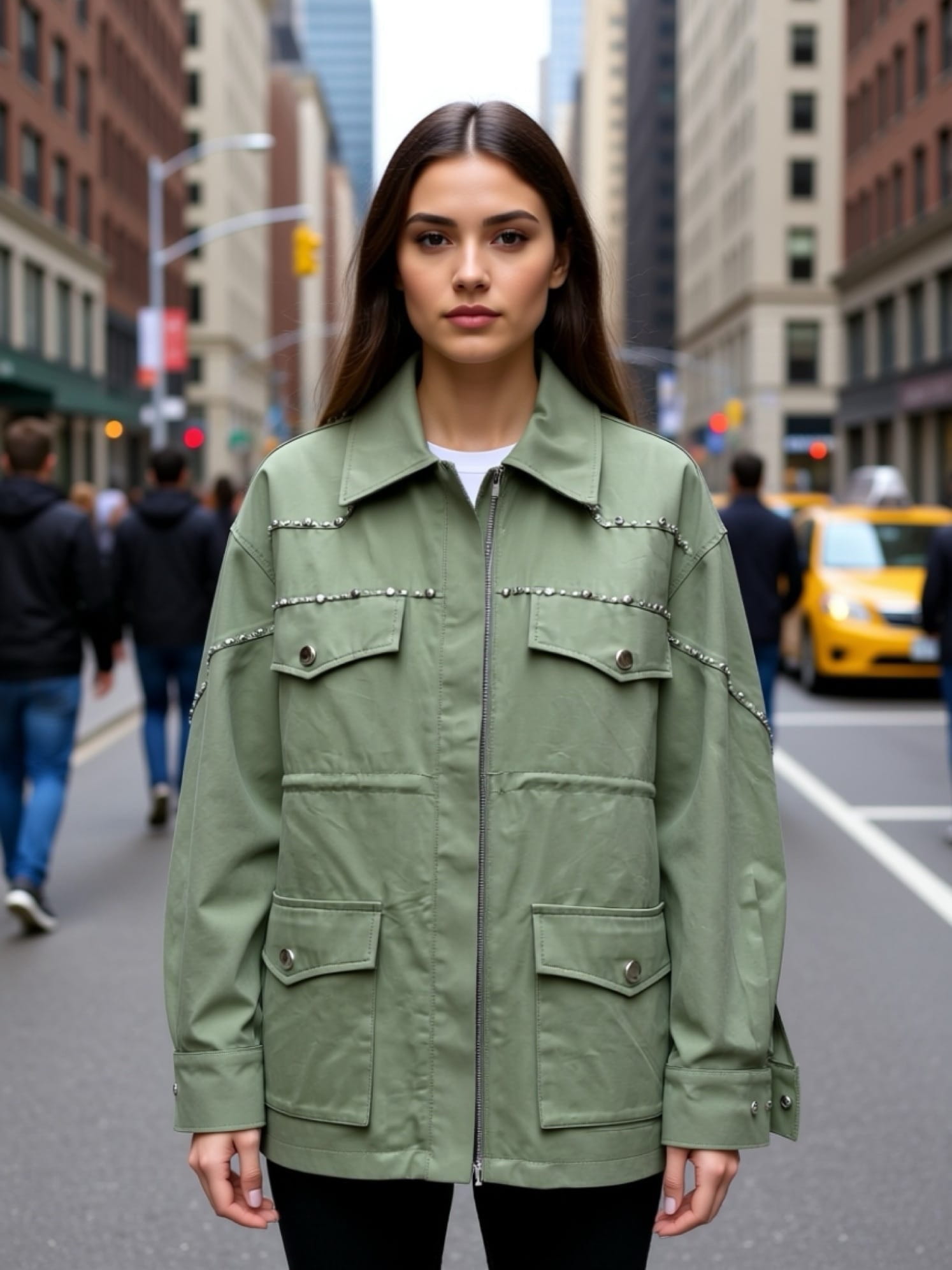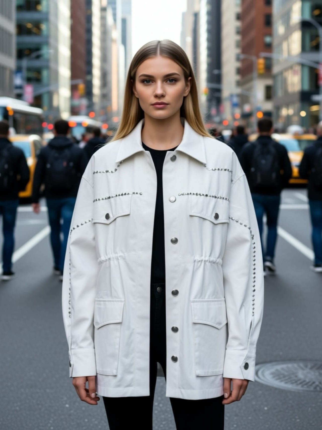 Kurta o prostym kroju. Zapinana na guziki. Gumka z troczkiem w pasie. Ozdobne elementy metalowe. Podszewka.
