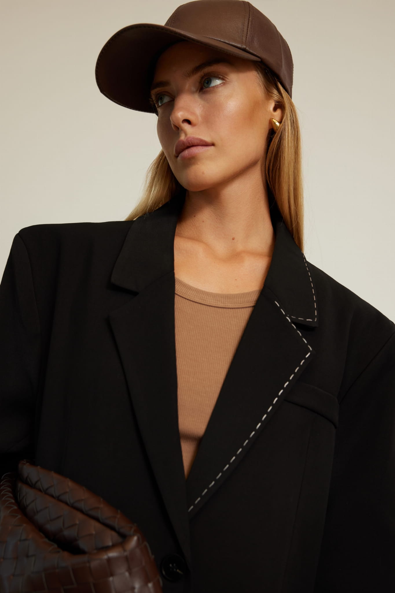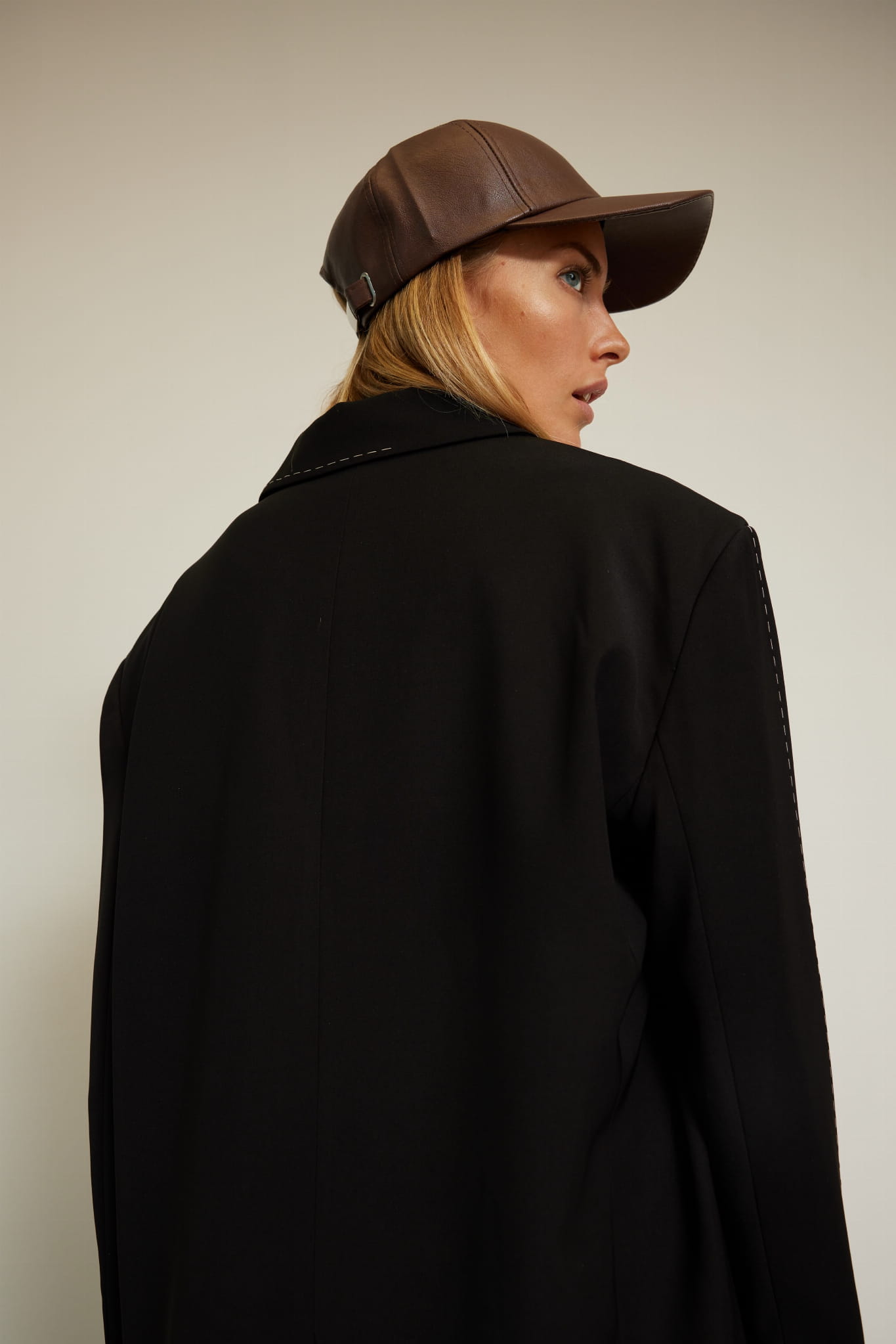 Czarna, elegancka marynarka oversize z ozdobnym, kontrastowym ściegiem na klapie i rękawach.