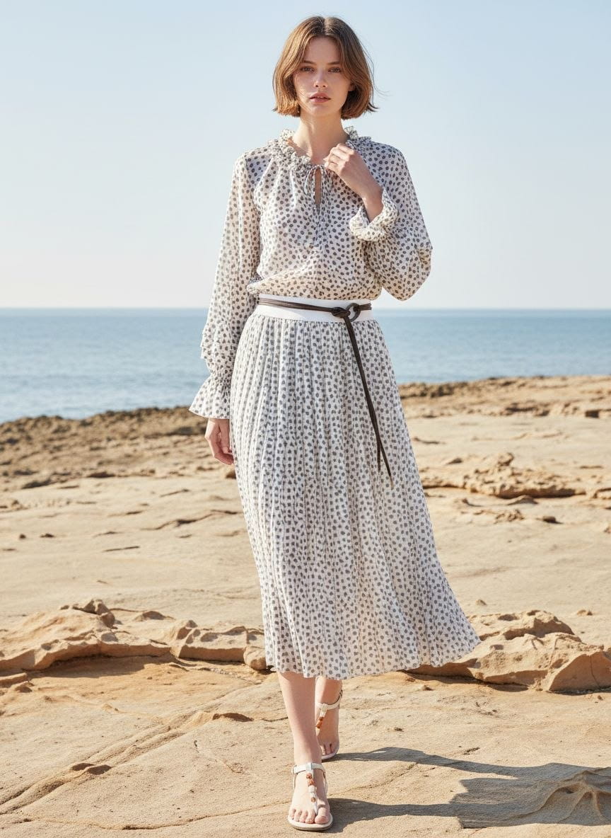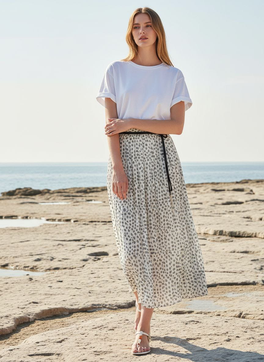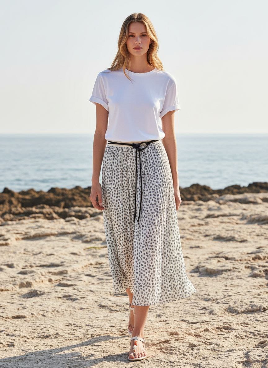 Spódnica w kropki, rozkloszowana. W pasie na gumce