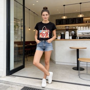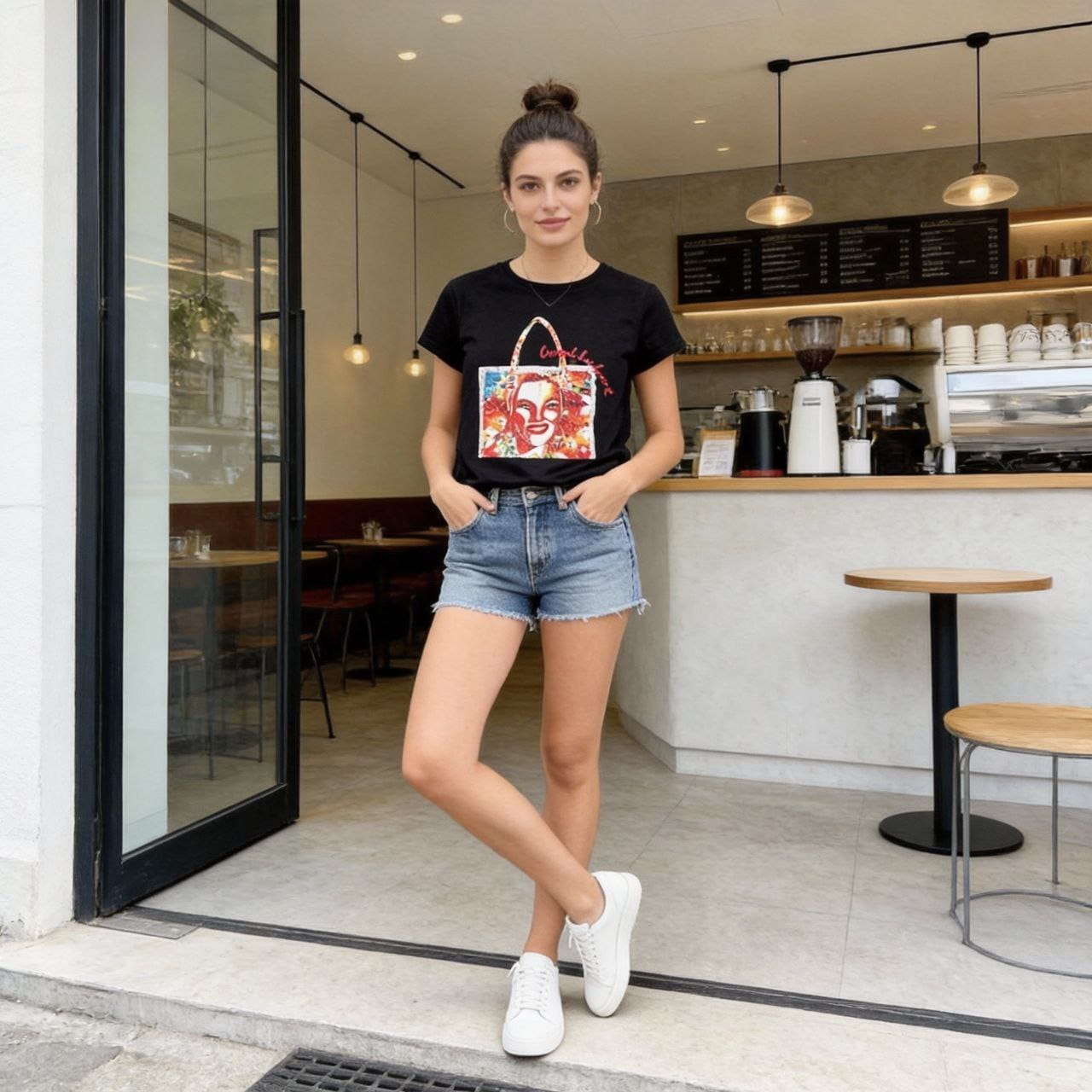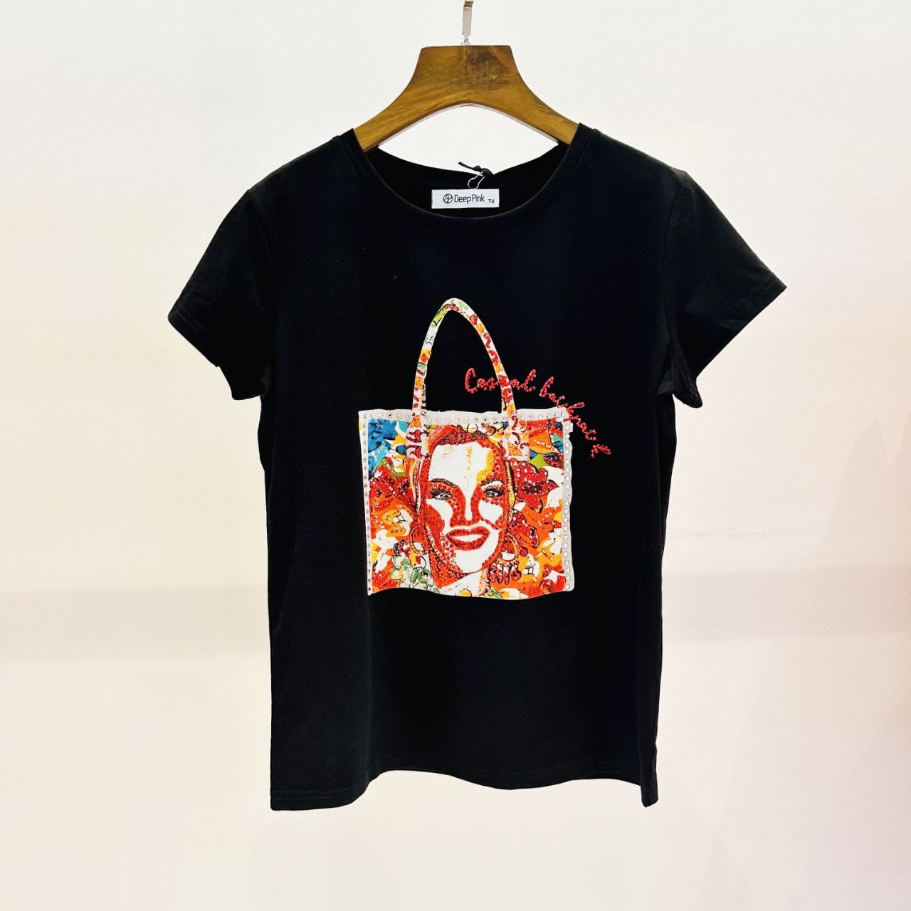 T-shirt z wysokiej jakości bawełny z nadrukiem i kryształkami.